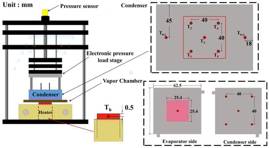 The experimental setup is shown in Figure 8 and Figure 9, while Figure 10 clearly indicates the temperature measurement points and dimensions. The power of the heater is controlled using a GW Instek PSW 80–40.5 power supply (New Taipei City, Taiwan), with a maximum output of 1000 W. During the design of the heater, it was ensured that the power output could be fully transferred to the VC, with power loss controlled within 1%. The condenser is maintained at a stable temperature using a circulating water cooling system. During the testing process, the temperature at the inlet and outlet of the cooling water is measured, ensuring the temperature difference remains within 1 °C to ensure the condenser’s temperature can be considered uniform. If the temperature difference exceeds 1 °C, the cooling water flow rate is adjusted for control. The VC will be subjected to a fixed pressure of 20 kgf using an electronic pressure loading platform to ensure stable contact with both the condenser and the heater. Additionally, an L-shaped spacer is designed for positioning to ensure that each test is conducted at the same location with the same pressure. After completing the test, temperature data are recorded using the KEYSIGHT 34972A data acquisition system (Santa Rosa, CA, USA), which is then transmitted to a computer for further analysis to evaluate the performance.