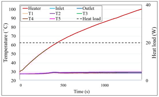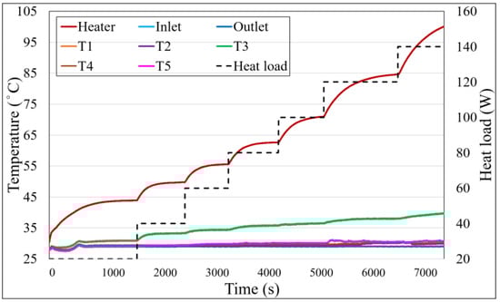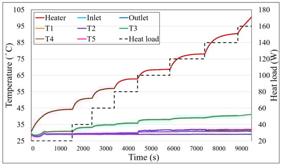 Figure 11 illustrates the temperature profiles of the cooling water inlet and outlet, the condenser side temperatures (T1 to T5), and the heater temperature (TH). The applied heating power is marked with a black dashed line, and the corresponding values are indicated on the secondary axis. The results show that the heater temperature continuously increases after heating begins. Although the temperature gradient slows down over time, the heater temperature reaches and exceeds the experimental equipment’s limit of 100 °C at approximately 1400 s. To ensure equipment safety and maintain experimental consistency, the test was paused at this point, preventing the acquisition of actual steady-state data. Furthermore, the condenser side temperatures are almost identical to the cooling water temperatures, highlighting the limitations of WVC without a capillary structure.