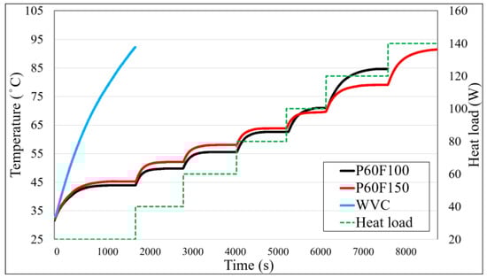 The condenser in this study is designed to handle a maximum thermal load of 1000 W. However, the experimental maximum thermal load was limited to 140 W due to the restriction of the heater surface temperature to 100 °C. Under these conditions, the condenser’s cooling capacity was sufficient to dissipate the heat supplied by the heater. The following sections analyze the temperature profiles of different samples (WVC, P60F100, and P60F150), focusing on the impact of capillary structures on vapor chamber performance.