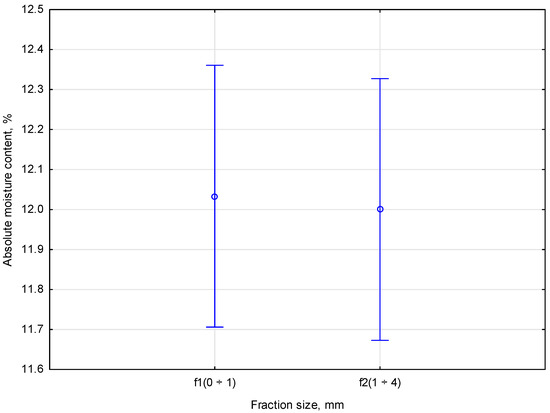 The measurement results for three replicates of the f1 (0 ÷ 1) Pinus sylvestris fraction were 12.1%, 12.1%, and 11.9%, respectively. On the other hand, for the wood fraction f2 (1 ÷ 4), the measurement results for three replicates were 12.2%, 11.7%, and 12.1%. The results indicated consistency in the f1 (0 ÷ 1) and f2 (1 ÷ 4) wood fractions. Approximately 12% of the samples from fractions f1 (0 ÷ 1) and f2 (1 ÷ 4) had an absolute moisture content. The results of the tests were statistically analyzed by univariate ANOVA using the methodology. The average impact of the total moisture content on individual Pinus sylvestris fractions is presented in Figure 3.