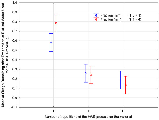 The study focused on the remaining sludge after evaporating distilled water during water extraction (HWE). Fractions were created and subjected to three HWE processes, each consisting of three repetitions, and values were calculated for each fraction. After the third extraction cycle, f2(1 ÷ 4) showed the least sludge. As a result, a large amount of sludge developed in the same fraction f2(1 ÷ 4). The reduction in the amount of sediment in each fraction during the HWE cycles was estimated; this indicated that sediment levels limit Pinus sylvestris extraction. The graphic analysis of the statistical analysis by ANOVA of the main effects, including the mass of residue left after the evaporation of distilled water in HWE, depending on the size and number of repetitions, is presented in Figure 4.