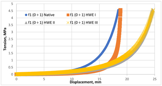 The compaction of the wood biocomposite was performed on a dedicated test stand using an Instron tester and a unique compaction head. According to the methodology, the force applied was enough to compact the material adequately. The compaction process involved the introduction of material into the compaction sleeve and gradual compaction under pressure. The compaction process was repeated three times for each material, and the average of these replicates is presented. The compaction of two Pinus sylvestris fractions, f1(0 ÷1) and f2(1 ÷ 4), was performed without additional material. The HWE process was applied before the compaction of these fractions. A study showed that the attempt to compact Pinus sylvestris wood fractions f1(0 ÷ 1) and f2(1 ÷ 4) after HWE at 22 °C did not yield the expected results since it failed to produce a uniform and consistent product. Several pieces of material were scattered after the compressed material left the chamber. The characteristics of the compaction process for fraction f1(0 ÷ 1) with different modifications are presented in Figure 5.