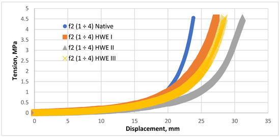 A further investigation of the thickening process focused on the f2 (1 ÷ 4) fraction. Similar to the previous results, this Pinus sylvestris fraction laboratory testing showed a slow pressure increase with increasing displacement. The analysis suggests that for HWE I, HWE II, and HWE III materials, displacement could continue to grow beyond the 4.5 MPa pressure limit of the test. The f2 (1 ÷ 4) HWE II material exhibited the highest level of compaction. Comparing the compaction behavior of the hot-water-extracted material with the untreated material, it can be concluded that the HWE process increased the material compressibility. The compaction characteristic of the concentration process for fraction f2 (1 ÷ 4) is presented in Figure 6.