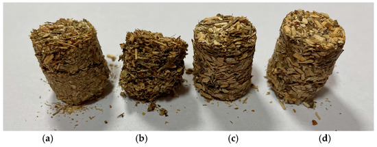 Material: (a) Pinus sylvestris fraction f1(0 ÷ 1)—Native—after compaction without HWE; (b) Pinus sylvestris fraction f1(0 ÷ 1) after HWE I; (c) Pinus sylvestris fraction f1(0 ÷ 1) after HWE II; (d) Pinus sylvestris fraction f1(0 ÷ 1) after HWE III.