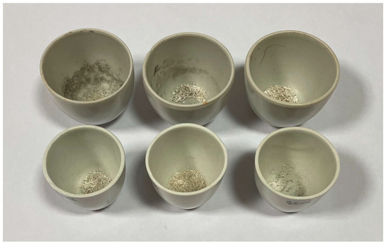To determine the ash content of the test material, the sample had to be ash at high temperatures. This was followed by the accurate weighing of the residue. The ash content may reflect the densification process (brittle material), as stated in the literature [20]. The samples were burned at 800 °C in a SNOL muffle furnace. The residual ash was then weighed using an analytical balance to determine the ash content. Examples of the ash samples used for examination are presented in Figure 9.