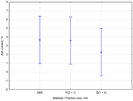 An analysis of the ash masses resulting from the combustion of three different materials was conducted. The materials included ABS f1 (0 ÷ 4), wood fraction f1 (0 ÷ 1), and wood fraction f2 (1 ÷ 4). The ABS sample produced ash masses of 0.004 g, 0.045 g, and 0.061 g, with an average of 0.037 g. The Pinus sylvestris wood fractions f1(0 ÷ 1) yielded ash masses of 0.333 g, 0.037 g, and 0.038 g, averaging 0.136 g. The wood f2(1 ÷ 4) sample resulted in ash masses of 0.012 g, 0.016 g, and 0.040 g, with an average of 0.023 g. The analysis showed that Pinus sylvestris wood fraction f1(0 ÷ 1) produced the most ash (0.136 g), followed by ABS (0.037 g) and then wood fraction f2(1 ÷ 4) (0.023 g). This suggests that larger wood pieces (f2) burn with less ash than smaller ones (f1). The most considerable ash amount was generated from wood fraction f1(0 ÷ 1). A graphical representation of the univariate ANOVA analysis of the ash content for the different materials, illustrating the relationship between the material type and the resulting ash content, is presented in Figure 10.
