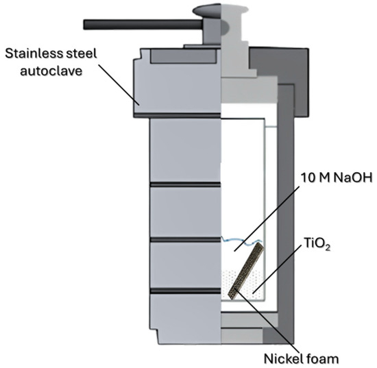 In the first step, 60 mL of 10 M NaOH (POCH Avantor; Gliwice, Poland) was mixed with 1.5 g of either P25 (Evonik; Essen, Germany) or KRONOClean®7050 (Kronos International; Leverkusen, Germany) in an ultrasonic bath for 15 min. The mixture was then transferred to a Teflon insert (100 mL) of a stainless-steel autoclave. Nickel foam (Nanografi Nano Technology; Ankara, Turkey) 2 × 2 × 0.1 cm was cleaned by rinsing with acetone (Chempur; Piekary Śląskie, Poland) and deionized water, then placed at an angle of 45 degrees to the autoclave wall, together with NaOH/TiO2 suspension. The way it was performed is shown in Figure 1. The autoclave was heat-treated in an oven for 24 h at 150 °C. After cooling down to room temperature naturally, the whole mixture was vacuum filtered under 760 mbar and then rinsed with deionized water until a pH of 7 was reached. The pH was controlled via pH test strips (pH-Fix 7.0–14.0; MAcherey-Nagel; Dueren, Germany). Nickel foam was simply rinsed with deionized water in order to get rid of loosely adhered alkaline TiO2 particles. After drying in an oven at 70 °C for 24 h, 0.75 g of obtained powder and nickel foam was mixed with a given amount of 0.1 M HNO3 (Chempur; Piekary Śląskie, Poland) for 6 h in order to remove Na+ cations. The following amounts of HNO3 were applied: 0, 5, 10, and 15 mL. The mixture was then filtered under a vacuum and rinsed until a pH of 7 was reached. Both the obtained mixture and nickel foam were then put into the autoclave for the second hydrothermal treatment at 180 °C for 24 h. The mixture and nickel foam were then rinsed with deionized water and dried in an oven at 70 °C for 24 h. Both the powder and the nickel foam/TNRs obtained were further analyzed.