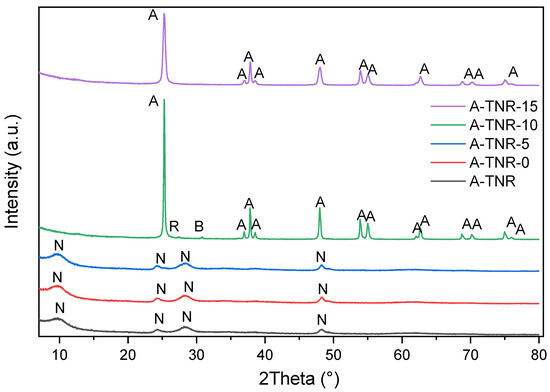 The obtained results showed that the crystal structure of the formed TiO2 depended on the quantity of nitric acid used for synthesis. Titania samples originated from anatase (KRONOClean®7050) flushed by a small quantity of nitric acid such as 5 mL (A-TNR-5) or prepared without treatment with acid (A-TNR and A-TNR-0) showed the presence of a Na2Ti3O7 phase. Contrary to that, the samples treated with 10 or 15 mL of HNO3 (A-TNR-10 and A-TNR-15) showed the structure of anatase with a minority of brookite and rutile or anatase only (intensive reflex at a 2Ѳ angle of 25.2), respectively (Figure 3).