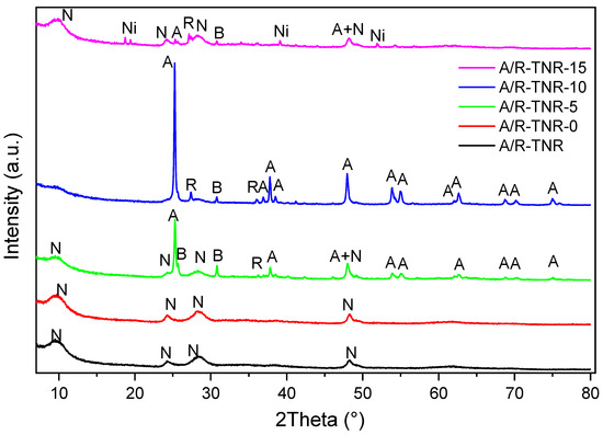 XRD diffractograms of anatase- and rutile-originated TNRs (without nickel foam). A—anatase, B—brookite, R—rutile, N—Na2Ti3O7, Ni—Ni(OH)2.