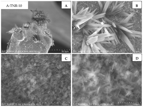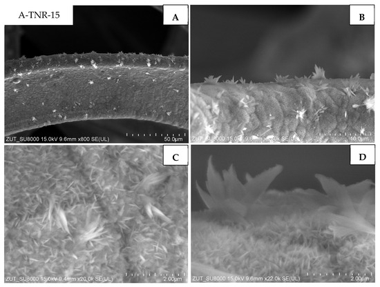 SEM images of A-TNR-15 in magnification: (A) 50 µm, (B) 10 µm, (C,D) 2 µm.