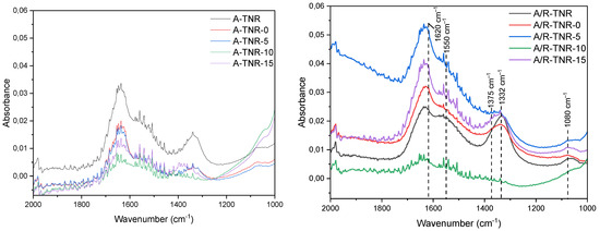 FTIR-ATR analysis of the powder samples obtained is presented in Figure 13. Note that they were tested without the presence of nickel foam. One of the noticeable differences between the samples here is in the intensity of the band originating from the hydroxyl groups, located at a wavenumber of 1620 cm−1. According to other studies, the transformation of the phases of TNRs during the heating is strongly related to the dehydration process of the titania layered structure [19]. This hypothesis strongly overlaps with our findings, as high hydroxylation of TiO2 usually implies incomplete conversion of the titanate phase into anatase, rutile, or brookite. Accordingly, samples such as A-TNR, A/R-TNR-0, A/R-TNR-5, and A/R-TNR-15 exhibited the strongest intensity of the –OH band and were consequently not fully crystallized into TiO2. At the same time, samples of the weakest –OH band intensity, such as A-TNR-10, A-TNR-15, and A/R-TNR-10, were the ones that revealed a high-intensity anatase reflex on XRD patterns. The other band, which appeared at 1375 cm−1, can be assigned to the vibrations of nitrate anions [35]. An additional band can be observed at 1332 cm−1, which is most likely due to the presence of either carbonates or bicarbonates, and is more intensive, the more alkalic the sample surface is [36]. This band disappeared after acid washing with 10 mL and crystallization of TiO2. However, under an excess of HNO3 washing (15 mL), this band emerges again on the FTIR spectra of both titania samples. NaOH treatment caused disruption of the titania crystal structure and increased the affinity of the titania surface to CO2 adsorption. The observed band at around 1550 cm−1 can be assigned to carbonate species and that at 1080 cm−1 to C-O vibrations. The intensity of these bands decreases with the rinsing of Na.