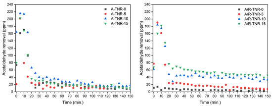 Photocatalytic tests for acetaldehyde removal are shown in Figure 14. These tests were performed at an elevated temperature (100 °C) to increase the overall process performance due to the catalytic activation of nickel foam. This phenomenon was reported in our previous paper [1]. Because of the relatively low flow rate of gas entering the reactor, which favors adsorption, the experiment could be divided into two stages: adsorption and photocatalytic decomposition. At the low flow rate used, the adsorption step took about 20 min. All the samples except one, originating from P25 untreated by the nitric acid (A/R-TNR-0), showed significant adsorption of acetaldehyde with a maximum of around 220 ppm for A-TNR-10. Although the acetaldehyde adsorption was high on the prepared samples, its photocatalytic decomposition was rather poor, only A/R-TNR-10 and A/R-TNR-15, originating from P25, showed noticeable activity. This was probably caused by the strong adsorption of formed carbonate species on the titania surface upon acetaldehyde oxidation and their resistance to further decomposition.