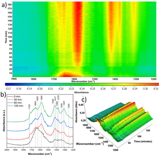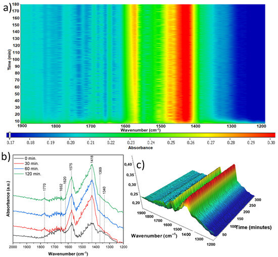 In situ FTIR of A-TNR-15 during the photocatalytic removal of acetaldehyde: (a) 2D mapping projection of the A = f(t, ν) relationship, (b) A = f(ν) graph after 0, 30, 60, and 120 min, (c) 3D mapping of the A = f(t, ν) relationship.