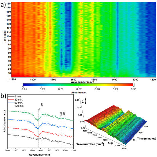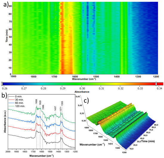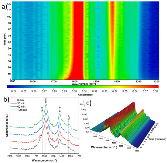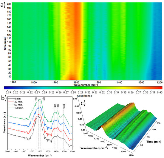 In situ FTIR of A/R-TNR-15 during the photocatalytic removal of acetaldehyde: (a) 2D mapping projection of the A = f(t, ν) relationship, (b) A = f(ν) graph after 0, 30, 60, and 120 min, (c) 3D mapping of the A = f(t, ν) relationship.