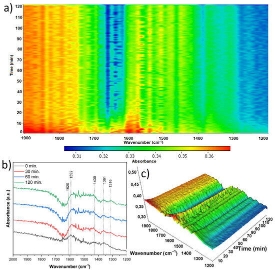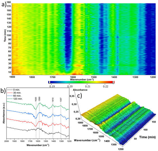 In situ FTIR of A/R-TNR-10 during the photocatalytic removal of acetaldehyde: (a) 2D mapping projection of the A = f(t, ν) relationship, (b) A = f(ν) graph after 0, 30, 60, and 120 min, (c) 3D mapping of the A = f(t, ν) relationship.