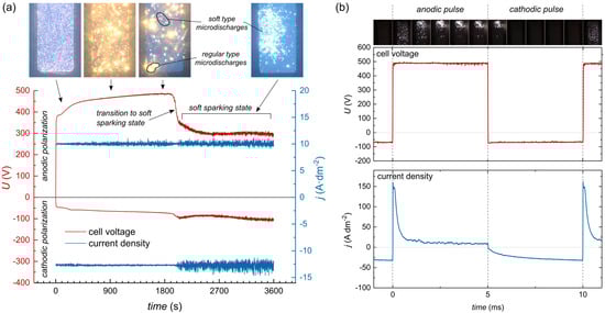 (a) Cell voltage and average current density of AC PEO during whole process; waveform of voltage and current density during a single cycle; (b) PEO process parameters: jA av = 10 A dm−2, f = 100 Hz, RC/A = 1.25, DA, DC = 50%. Exposure time of photos: (a) 20 ms, (b) 0.5 ms.