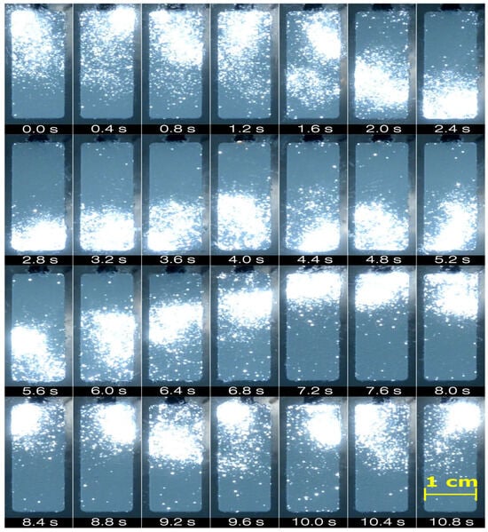 The images above the plot show micro-discharges on the electrode surface during various stages of the PEO process. Before the transition to SSS, two distinct types of micro-discharges were visible: larger yellowish (regular type) discharges and smaller whitish (soft type) discharges. As time progressed, the proportion of soft-type discharges increased, while regular discharges diminished. After transitioning to SSS, regular micro-discharges disappeared completely, and only soft-type micro-discharges remained on the electrode surface. This change in micro-discharge type, correlated with the reduction in anodic voltage, indicates that soft-type micro-discharges occurred at a much lower ohmic resistance of the oxide layer. Soft-type micro-discharges differed from the regular ones not only in appearance but also in spatial occurrence. Instead of the random occurrence of micro-discharges across the entire electrode surface, they were concentrated in a smaller area at a time, continuously sweeping the whole electrode surface. The sequence of photos in Figure 2 shows this characteristic discharge movement, which was present during the whole SSS. This phenomenon is always observed during SSS in the PEO process run in the presented conditions.