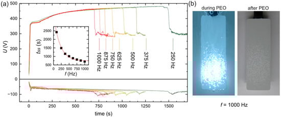 The effect of increasing frequency on the time of soft-sparking transition: (a) cell voltage during PEO and time to transition (tss) plotted vs. frequency; (b) photos of the electrode oxidized at f = 1000 Hz during and after the process. PEO process parameters: jA av = 10 A dm−2, RC/A = 1.25, DA, DC = 50%. Exposure time of photos: 20 ms.