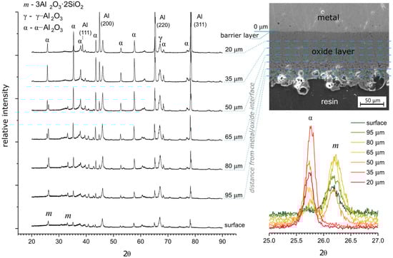 In general, the very porous structure of the oxide layer surface after soft sparking, described in the previous paragraph, constitutes only the topmost layer of the total coating thickness, which has poor mechanical properties. Beneath this porous layer, the oxide exhibits a more solid structure. Figure 5 presents the phase analysis of the bulk oxide of the formed layer at different depths. On the surface and in the outer parts of the layer a mullite and γ-Al2O3 phases are predominant. However, going toward substrate, the mullite phase contribution decreases at the expense of the increasing amount of α-Al2O3 phase. In deep parts of the layer, below 35 μm from the oxide/metal interface, the mullite phase is absent and the layer is composed of only α- and γ-Al2O3. Diffractograms also show that the closer to the surface the more amorphous the layer is while going into the bulk, the higher the number of crystalline phases. In the case of oxide layers produced in DC or the pulsed mode regime (without the presence of cathodic current and with the rest of process parameters kept unchanged), they do not exhibit such a composition gradient. They have constant composition over the cross-section of the layer with a predominant mullite phase. This difference in silicon content gives a clear indication that different anionic species are involved in anodic reactions during layer formation under AC and DC conditions.