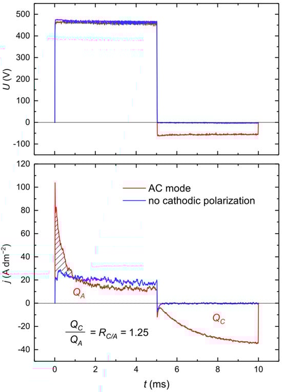 Figure 6 presents the cell voltage (top) and the current density (bottom) waveforms during a single cycle from the 10th minute of AC PEO (red curve) and with the cathodic polarization intermittently turned off (blue curve). Since the utilized setup maintains constant voltage during pulses, almost ideal square waveform of the cell voltage is observed on the top plot. Considering that the voltage is constant within a pulse duration, the current response directly represents instantaneous cell impedance changes. The areas under the current curve denoted as QA and QC represent the total charge during anodic and cathodic pulses, respectively. When the cathodic polarization (pulse) is absent, the anodic current during the anodic pulse is relatively flat, with a little noise from micro-discharge events. However, when the cathodic polarization is present, at the beginning of the anodic pulse, a large current spike is formed. This shows that the cathodic pulse causes a high current flow at the beginning of the anodic pulse. This may be related to (i) recharging of the electrode capacitance, which was charged with reverse polarity in the previous cathodic pulse, or (ii) fast oxidation of products from reactions during the previous cathodic pulse and accumulated at the interface. The effective electrode capacitance is considered oxide layer capacitance and double-layer capacitance connected in series. The charge corresponding to the peak, marked as the dashed area on the plot in Figure 6, is about 1.85 × 10−4 Q cm−2. Since the average voltage is 462 V, the capacitance related to this charge can be calculated from formula C = Q/V ≈ 400 nF cm−2. The electrode capacitance at this stage of PEO estimated by electrochemical impedance spectroscopy (EIS) measurements performed in stationary conditions in 0.1 M Na2SO4 is about 90 nF cm−2 [21]. Recent measurements of the electrode capacitance by the authors (not published) performed in the same electrolytes used during oxidation and with a shorter interval time between PEO and EIS showed a slightly higher value—about 100 nF cm−2, but this value can still be underestimated, considering that electrode capacitance during PEO can be higher due to adsorption processes during cathodic polarization. However, assuming similar values of the electrode capacitance during the oxidation process, the current peak at the beginning of the anodic cycle is composed of both charging and Faradaic current.
