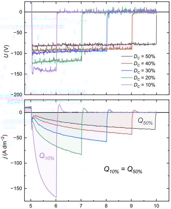 Cell voltage (top) and current density (bottom) during cathodic pulses with different cathodic pulse duty cycles (DCs) during SSS. Process parameters: jA av = 10 A dm−2, f = 100 Hz, RC/A = 1.25, DA = 50%.