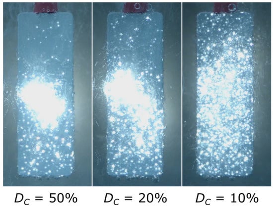 Since jC av was the same, the total charge in the pulse (Qxx%) was equal for all cases. To maintain the same charge during cathodic pulses with different durations, higher instantaneous current for shorter pulse duration is required. A higher cathodic current forces the creation of a larger number of active sites on the electrode where a hydrogen evolution reaction can take place. The photos in Figure 8 show the spatial distribution of micro-discharges on the electrode surface for different DCs. It is clearly visible that at lower pulse duty cycles, the arrangement of micro-discharges became more dispersed. Therefore, it can be concluded that the active sites created during a cathodic pulse become the places where micro-discharges are initiated in the following anodic pulse. The question arising is why micro-discharges change place since active sites should also be more “attractive” for a cathodic reaction.