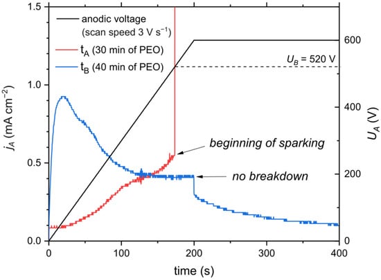 In Figure 9, the linear scans of anodic polarization in the range of 0–600 V of samples from two different stages of PEO (marked also in Figure 1 as tA and tB) are presented. Sample “A” came from the 30th minute of PEO—thus, before SSS transition, whereas sample “B” came from the 40th minute of PEO—after SSS transition. In the case of sample “A”, the current density increased gradually with the increase in anodic voltage until the breakdown voltage of oxide film was reached; then, a sharp increase in current was observed. The film was broken down at 520 V (some single sparks appeared slightly earlier, causing a tiny current peak, but the oxide film recovered), which is a slightly higher value than the anodic voltage at this stage of PEO (~480 V). In case of sample “B”, at the beginning of anodic polarization, the current density increased rapidly, reaching almost 1 mA cm−2, and then declined asymptotically. Interestingly, the oxide layer did not undergo electrical breakdown within the scan range, despite the anodic voltage being approximately 300 V at this stage of PEO. The oxide layer had initially lower resistance due to active sites in the barrier layer that were sealed by the formation of fresh hydroxide/oxide after applying anodic polarization. Therefore, anodic polarization has a “sealing effect” via the oxidation of active sites that are created during cathodic polarization. Since sealed active sites have very high resistance, indicated by the lack of breakdown up to 600 V, such an unsealing–sealing mechanism is responsible for the randomization of micro-discharges. It is worth noting that active sites do not necessarily need to change spots of occurrence in each cycle of AC during PEO. Depending on the size of the active site, this complete process, from creation to suppression of the active site, may occur over more AC periods. It was reported previously by Nominé et al. [24] that micro-discharges form localized discharge cascades consisting of up to hundreds of individual discharges and can persist at the same location over several AC voltage cycles. For the present work, a similar observation was made for SSS based on micro-discharge image analysis, where the lifespan of the active site was up to several hundreds of milliseconds.