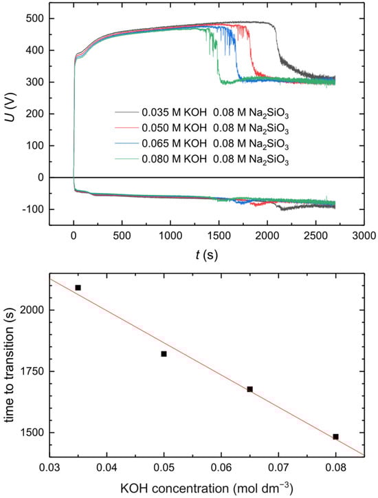 In Figure 10, cell voltages during AC PEO performed at different concentrations of potassium hydroxide in the electrolytes, with the concentration of sodium silicate kept at the same level of 0.08 M, are presented. The higher the alkalinity of the electrolytes, the shorter the time required for transition to SSS, and it is visible that this relationship is quite linear. Monfort et al. [25] reported that higher concentrations of KOH in electrolytes provides a lower growth rate of the oxide layer. Taking this into account, as well as the fact that SSS requires a certain minimal volume of the oxide layer (volume of voids for OH− ion accumulation), this relationship may be explained as follows. In fact, the real growth rate of the oxide layer in more alkaline electrolytes is higher, but due to the higher chemical dissolution rate of oxide in such electrolytes, the apparent growth rate is lower. Therefore, in more alkaline electrolytes, a certain level of voids in the oxide layer may be achieved after a shorter period of time. Another interesting observation is that anodic voltage during SSS does not depend on the electrolyte alkalinity but rather on RC/A, as was previously shown [20]. Therefore, the concentration of OH− ions in the vicinity of the interface is determined by the cathodic-to-anodic reaction charge ratio, not by the concentration of OH− ions in the bulk electrolytes, in the investigated range of the KOH concentration.