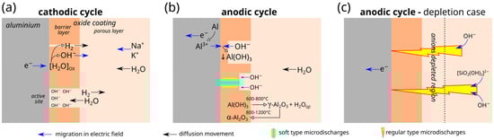 Concept scheme of ion transport during oxide-layer formation in AC mode: (a) cathodic cycle; (b) anodic cycle; (c) anodic cycle—depletion case.