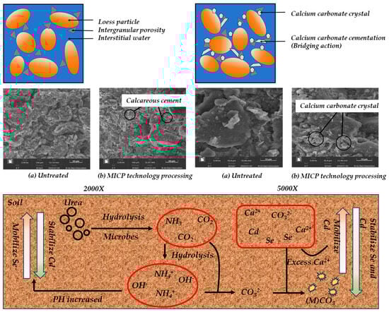 - Zhou, X.; Wang, G.; Zhang, H.; Jia, C.; Tang, G. Multi-scale analysis of the mechanism of microbially induced calcium carbonate precipitation consolidation loess. Environ. Sci. Pollut. Res. 2023, 30, 78469–78481. [Google Scholar] [CrossRef]
