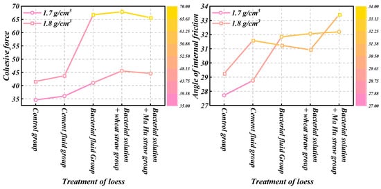 - When the density is 1.7 g/cm3, the loess cohesion of MICP technology combined with plant straw curing treatment increases again, while when the density is 1.8 g/cm3, the loess cohesion of MICP technology combined with plant straw curing treatment does not increase much. At the low density of 1.7 g/cm3, the loess cohesion of MICP technology combined with plant straw curing treatment does not increase much. The addition of plant straw plays a better role in solidifying loess.