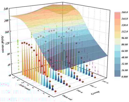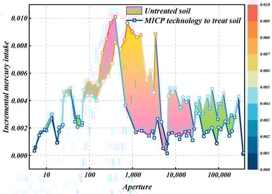 - The loess that has not been treated by MICP technology has more mesopores (pore radius 0.016–0.004 mm) and small pores (pore radius 0.004–0.001 mm). The content of large pores (pore radius > 0.016 mm) and small pores (pore radius < 0.001 mm) in the treated loess had little change or slightly increased compared with that of untreated loess, while the content of medium and small pores significantly decreased.