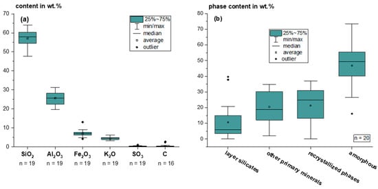 The loss on ignition was determined according to EN 196-2 [27] on samples of 1.00 ± 0.05 g at 950 °C in a muffle furnace. To analyze the carbon and sulfate contents, a carbon/sulfur analyzer, Eltra CS-2000 (co. ELTRA GmbH, Haan, Germany), was used. For this, 0.150 ± 0.001 g of the sample was weighed in an annealed ceramic crucible and covered with 0.7 g iron granules and 2.0 g tungsten granules. The crucible was sealed and put into the induction furnace for subsequent combustion at temperatures above 1800 °C in a pure oxygen stream. A double determination was performed. Further chemical analysis was performed by X-ray fluorescence using a Panalytical Axios X-ray fluorescence spectrometer (co. Malvern Panalytical GmbH, Kassel, Germany): 0.8 g of annealed samples of the samples mixed with 8.0 g lithium tetraborate LT100 (co. XRF Scientific Europe GmbH, Karlstein, Germany) to produce fused tablets using a Vulcan fusion machine 4MA (co. PD Instruments, Toszek, Poland).