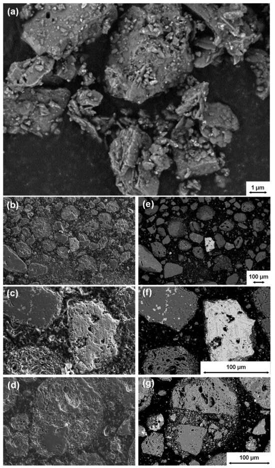 The tailings sample for the industrial cement production trial in Section 3.2 was provided from a tailings dump in Saarland, Germany, where, due to restructuring work, an operation was carried out in the heap body, and the material could be removed without applying for complex mining permissions. The sample for the investigations on single fractions in Section 3.2.1 was taken in several sub-samples (~60 kg in total). They were taken from the running conveyor at the output of a processing operation of about 1000 tons from a side part of the heap body to obtain a sample that is as representative as possible. However, since the properties of individual grains are investigated, as described in the following, the representativeness of the sample is not relevant. For project-specific reasons, only a low degree of processing was applied. Approx. 100 tons of the processed material were provided in an air-dried condition (water content ~3.5 wt.%) for the industrial cement production trial in Section 3.2.2.