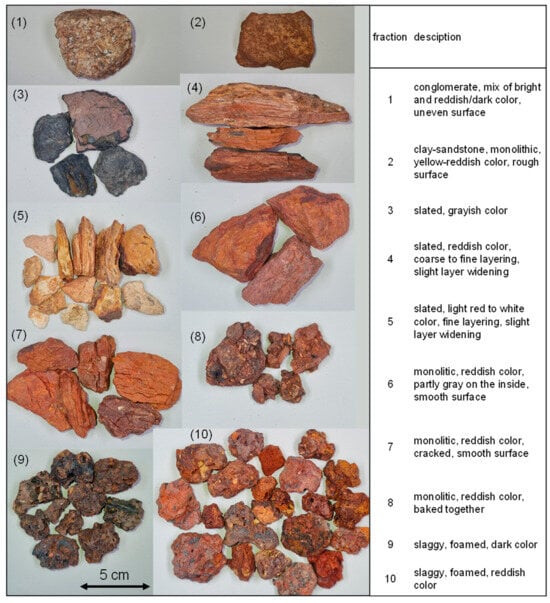 Many of the tailings have been exposed to increased temperatures due to spontaneous combustion of the coal residues or are currently burning, which is a worldwide phenomenon. The exothermic process of oxidation of the coal residues contained in the tailings, often in interaction with the oxidation of pyrite as a typical accompanying mineral, leads to spontaneous combustion of the tailings under suitable boundary conditions (oxygen supply, temperature, pressure, coal content) [3,4]. Furthermore, human interference with the heap body is often the cause of fires. The influence of temperature on the originally clayey tailings potentially leads to pozzolanic properties and thus provides the basis for the use as supplementary cementitious material (SCM), e.g., the BMU states the average proportion of clay minerals in the tailings dumps of the German Ruhr area to be 59–73 wt.% [1].