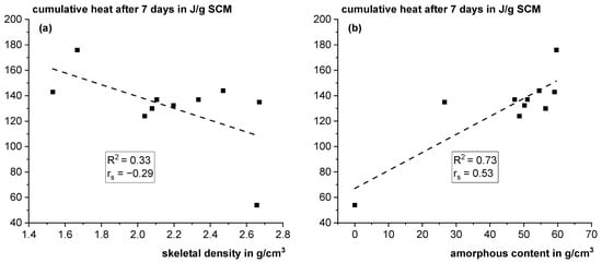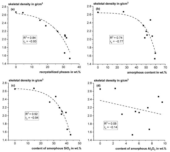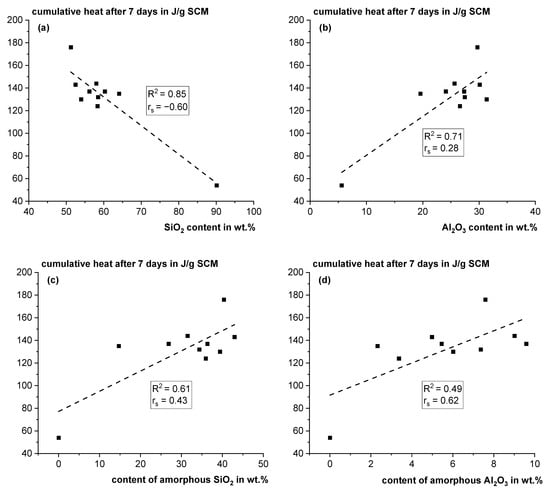 The reactivity of the amorphous phases depends on their chemical composition and structure. The reduction in reactivity due to the crystallization of Al-/Si-rich mineral phases at high temperatures is based on the assumption that the Al or Si ions, which were previously easily soluble in the metastable phase, are incorporated into a thermodynamically more stable crystal lattice. However, there are no detailed studies on how inert/stable these recrystallized phases are in cementitious systems or how the properties of the residual amorphous structure are affected. In addition, depending on the chemical composition, a reactive melt phase may again be formed when the temperature is further increased, e.g., for pure mullite, this temperature is ~1800 °C [16]. However, other mineral components, such as feldspars, can act as fluxes and reduce the melting temperatures [17].