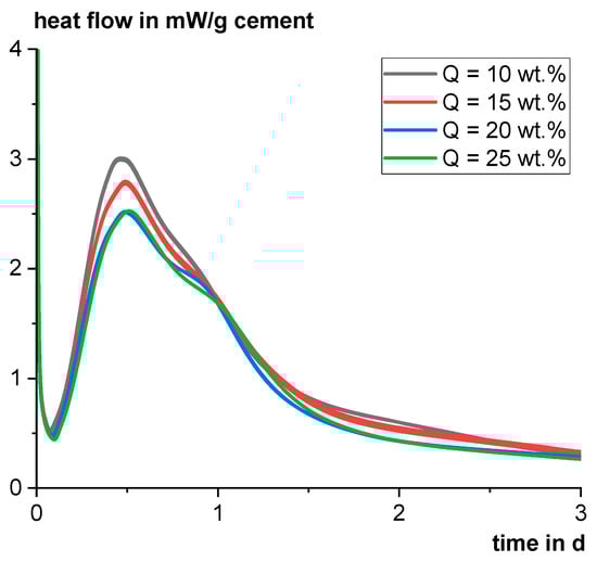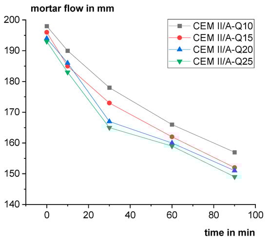 During the cement production, the clinker was ground in the industrial ball mill together with the sulfate carrier, limestone (target value of 5 wt.%), a grinding aid, and the tailings material. According to the cement standard EN 197-1 [50], pozzolans can be assigned as “P: natural pozzolan” or “Q: natural tempered pozzolan”. Although the autogenously calcined tailings material was not actively tempered, it is referred to as Q in the following. Q was fed in four different stages in which the proportion was progressively increased (10, 15, 20, 25 wt.%). The grinding process was adjusted each time to achieve a comparable particle size distribution, which was measured continuously during grinding. Approx. 150 tons of cement were produced with 20 wt.% of Q for further application. The cements with 10, 15 and 25 wt.% were only produced for the laboratory tests, and after sampling, the remaining cements were diverted to a separate silo. Representative samples of about 30 kg of each produced cement were taken from the running conveyor for the presented investigations.