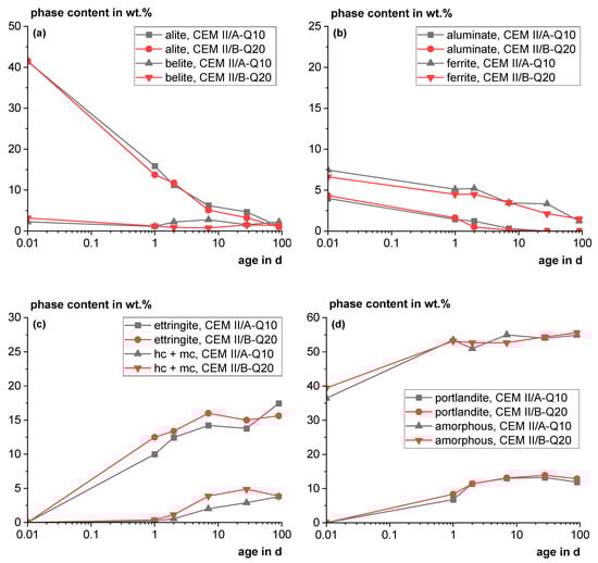 Phase contents as a function of time of the clinker phases (a,b) and the main hydration products (c,d) for the model mixture containing 20 wt.% Q normalized to 100 % cement (except the amorphous content) and the reference cement. (For illustration, in the logarithmic scale, the time point zero was set to 0.01 days.).