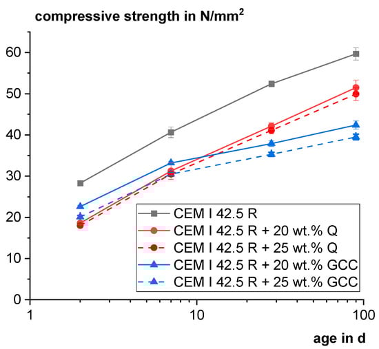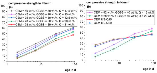 Development of compressive strength of ternary model mixtures (CEM: ~88 wt.% clinker, ~6 wt.% sulfates and ~6 wt.% limestone) (a) and a comparison of binders with 15 and 20 wt.% Q (b).