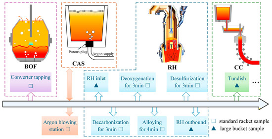To comprehensively investigate the evolution laws and formation mechanisms of typical inclusions in molten steel during the W350 non-oriented silicon steel smelting process, and to ensure the reliability of sampling and analysis results, four batches of molten steel samples were continuously taken during the same pouring planning. The samples were collected at the end-point of the converter, the argon blowing station, and the RH inlet, as well as after RH vacuum decarburization, aluminum deoxygenation, the first batch of alloying, desulfurization, RH outbound, and the tundish. Specifically, bucket samples were collected at the RH refining inlet, RH outbound, and the tundish to accurately assess their cleanliness. The specific sampling scheme is shown in Figure 1.