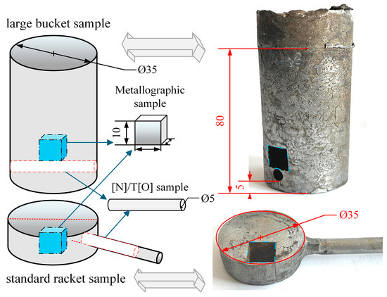 Systematic sampling was carried out according to the above scheme, where the large bucket sample (Φ35 mm × 80 mm) could extract more molten steel compared to the standard racket sample (Φ35 mm × 10 mm), as the bubbles in the molten steel could be fully floated during sampling. This resulted in more accurate test results. Some square metallographic samples with a specification of 10 mm × 10 mm × 10 mm were processed by wire cutting machine at the middle position of the standard racket sample and the middle position of the bucket sample above 5 mm from the bottom. Some nitrogen–oxygen analysis specimens, 5 mm in diameter, were cut near the bottom of the bucket sample and then sanded and polished for analysis. The specific processing diagram is shown in Figure 2.