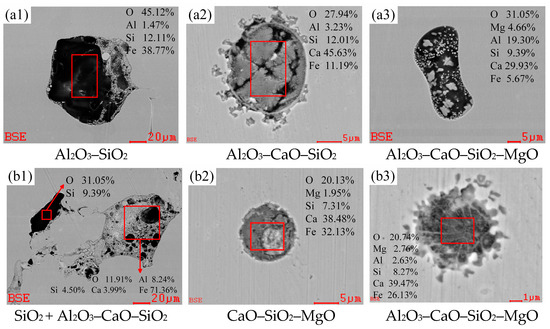Figure 4 presents the SEM images of typical inclusions at the end-point of converter blowing and the argon blowing station for W350 non-oriented silicon steel. The SEM analysis revealed that the types of inclusions present in the molten steel before RH refining were relatively complex, and their sizes were notably large. At this stage, the main inclusions were cluster Al2O3–CaO–SiO2 inclusions (Figure 4(a1,b1)) and ellipsoidal Al2O3–CaO–SiO2–MgO inclusions (Figure 4(a3,b3)), in which the mass fraction of MgO and Al2O3 were relatively low and the diameter sizes were mostly between 5 and 20 μm. In addition, a few polygonal SiO2 inclusions with a length of about 30 μm and spherical CaO–SiO2–MgO inclusions with a diameter of about 5~10 μm were found in the argon blowing station (Figure 4(b1,b2)). It is preliminarily inferred that the actual oxygen content in the molten steel before RH refining is higher than the equilibrium oxygen content [21], resulting in a significant quantity and a complex variety of inclusions. Therefore, RH refining is necessary to further eliminate these inclusions, thereby enhancing the cleanliness of the molten steel.
