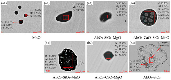Figure 5 shows the morphological and chemical composition changes of typical inclusions at various stages of the RH refining process, as obtained through SEM and EDS analysis. It was observed that there is a large number of spherical MnO inclusions with diameters ranging from approximately 1 to 3 μm, as well as ellipsoidal Al2O3–SiO2–MgO and Al2O3–SiO2–MnO inclusions, which have a major axis measuring about 5 μm. In addition, there is a small number of near-spherical Al2O3–CaO–SiO2–MnO and Al2O3–CaO–MgO inclusions with diameters ranging from about 2 to 5 μm in the molten steel after RH inlet (Figure 5(a1–a4)) and decarburization for 3 min (Figure 5(b1–b3)). This is due to the low [Al] and high [Mn] in the molten steel of converter outbound, so that a large amount of [Mn] in the molten steel is oxidized, resulting in the formation of MnO and its composite inclusions during the decarburization process. After the addition of aluminum for 3 min (Figure 5(c1–c3)), due to the binding capacity of the Al element and O element being stronger than that of the Si element, the inclusions predominantly evolve into Al2O3, which is in the shape of clusters, spherical shapes, and elongated strips, with diameters and lengths primarily ranging from 2 to 5 μm.
