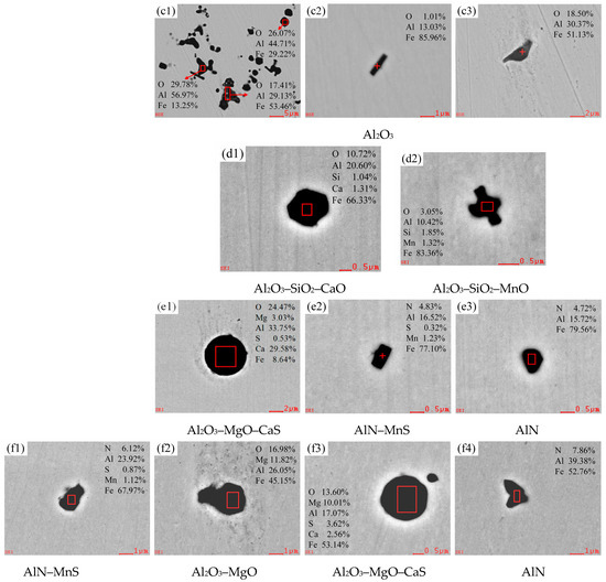 Typical inclusions during the RH refining process (at room temperature): (a1–a4) RH inlet; (b1–b3) RH decarburization for 3 min; (c1–c3) RH adding aluminum deoxygenation for 3 min; (d1,d2) RH for the first batch of alloying for 4 min; (e1–e3) RH desulfurization for 3 min; (f1–f4) RH outbound.
