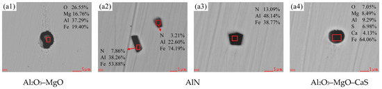 The generation of Al2O3–MgO significantly impacts the performance of finished steel. However, it can be determined that the raw materials added during the RH refining process do not contain magnesium. Many scholars [24,25] have noted that the Mg present in the non-metallic inclusions during the smelting process may originate from the MgO-containing dolomite used before the oxidation of carbon, phosphorus, aluminum, and silicon. It is more widely believed that it arises from the interfacial reactions between steel and slag, as well as the erosion of refractory materials by molten steel. Figure 6(a1–a4) shows the typical inclusions found in the tundish molten steel, which are mainly near-spherical Al2O3–MgO and polygonal AlN with arris or angles, along with a few elliptical Al2O3–MgO–CaS inclusions. The types and sizes of various inclusions in the tundish are basically the same as those in RH outbound, most of them are composed of deoxidation products in the molten steel and the lining or protective slag of the tundish. However, the number of inclusions has increased, which is consistent with the previous inference that there is a secondary oxidation phenomenon occurring in the tundish molten steel.