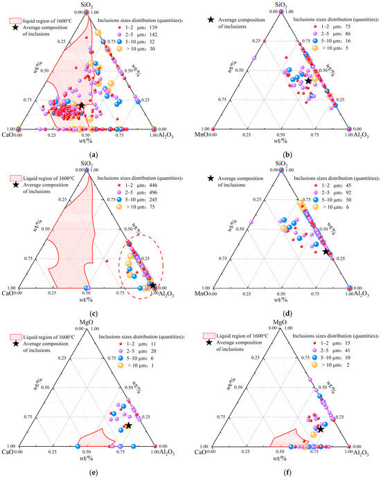 In the smelting process of W350 non-oriented silicon steel, factors such as the addition of raw materials, the steel–slag reaction, the erosion of refractory materials, and secondary oxidation during transportation can significantly influence the composition of oxide inclusions. Therefore, it is essential to thoroughly understand the compositional changes of oxide inclusions throughout the smelting process to effectively control the cleanliness of molten steel. To quantitatively analyze these compositional changes, the content of each element, as determined by ASPEX, is converted into the corresponding compound content based on the conservation of metal elements [14]. This approach is widely employed in the quantitative study of inclusion compositions [11,26]. In the experiment, inclusions screened from each sample under diverse smelting processes were carefully projected into the ternary phase diagrams of Al2O3–CaO–SiO2, Al2O3–SiO2–MnO, and Al2O3–CaO–MgO. The liquidus at 1600 °C was drawn by Factsage calculation, in which the area surrounded by the liquidus was regarded as the low melting point area. Finally, the composition, quantity, and size of oxide inclusions in each sample were subjected to statistical classification, as shown in Figure 7.