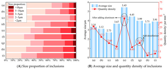 Variation in size and quantity of inclusions in molten steel under different production processes: (a) the end-point of converter blowing; (b) argon blowing station; (c) RH inlet; (d) after RH decarbonization; (e) after RH deoxygenation; (f) after RH alloying; (g) after RH desulfurization; (h) RH outbound; (i) tundish.