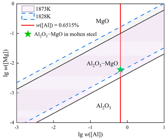 Table 5 shows the first-order interaction coefficients among the components in the molten steel [32]. According to the literature [33], when the MgO/Al2O3–MgO phase boundary is calculated at 1873 K, the activities of Al2O3–MgO and MgO are taken as 0.8 and 0.99, respectively. For the calculation of the Al2O3–MgO/Al2O3 phase boundary, the activities of Al2O3–MgO and Al2O3 are considered to be 0.47 and 1, respectively. In this experiment, the composition of the molten steel in the RH outbound, as detailed in Table 2, was selected for the aforementioned calculations. The results of these calculations are illustrated in Figure 9.