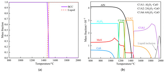 Figure 10 indicates that the liquidus temperature of W350 non-oriented silicon steel calculated by Thermal-Calc is 1489 °C, and the matrix is ferrite α phase after solidification. At temperatures exceeding 1600 °C, inclusions predominantly exist in a liquid phase, with calcium aluminate inclusions mainly manifesting as C1A1 (Al2O3–CaO) and C1A2 (2Al2O3–CaO) types. As the temperature decreases to 1460.7 °C, the MnS phase initiates precipitation. When the temperature further reduces to 1444.3 °C, the precipitation of Al2O3–CaO inclusions ceases, and most of these inclusions transition into 2Al2O3–CaO inclusions. At a temperature of 1422.2 °C, the AlN phase begins to precipitate. As the temperature continues to decrease to 1290.9 °C, C1A6 (6Al2O3–CaO) inclusions start to form. Subsequently, at 1259.8 °C, the precipitation of 2Al2O3–CaO inclusions halts, and these inclusions predominantly convert into 6Al2O3–CaO inclusions. Throughout the temperature range of 1000°C to 2000 °C, the sequence of inclusion transformation is as follows: liquid inclusion → Al2O3–CaO → 2Al2O3–CaO + MnS → 6Al2O3–CaO → Al2O3 + AlN + MnS + CaS.