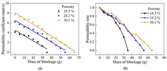 Figure 15 shows the curves of the pervious concrete with different porosities as a function of the amount of clogging material. It is evident that as the amount of clogging material increased, the pores gradually became blocked, leading to a deterioration in permeability. From Figure 15a, it can be observed that pervious concrete with a higher porosity initially has a higher permeability coefficient and can accommodate more clogging material. Figure 15b indicates that pervious concrete with a porosity of 18.3% experiences a rapid decrease in permeability with increasing amounts of clogging material, whereas the permeability of concrete with a porosity of 30.1% decreases more slowly as the amount of clogging material increases. Pervious concrete with higher porosity develops clogging more slowly, demonstrating better anti-clogging performance.